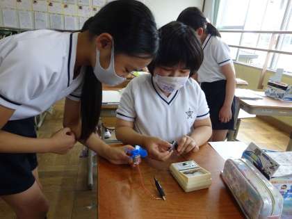電流を通してプリペラを動かしました。興味津々で実験に取り組んでいました。