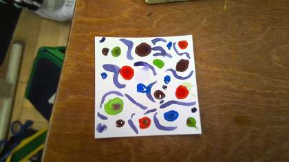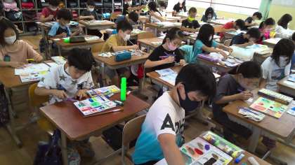 図画工作の学習では,それぞれの子どもたちが小さなカードに思い思いの模様を絵の具で描いています。自由参観の日には,自分たちの書いたカードを組み合わせ,素敵な色のひびき合いを感じてもらおうと思っています。