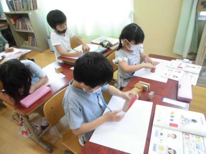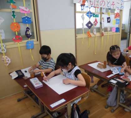 「さんかくをつかって,おにぎりをかきました」「まるをつかっておひさまをかきました」と,かたちをつかってさまざまな絵をかくことができました。