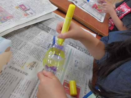 ペットボトルに油性マジックで色や模様をつけて,ひかりに透かして楽しみました。