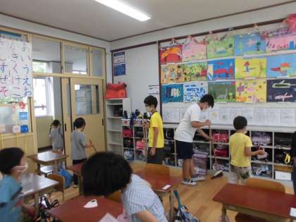 6年生のみなさんが,とても丁寧に,ほうきの使い方・雑巾の絞り方など,たくさん教えくれます。少しづつ自分たちに力になってきていると感じます。1年生が終わるころには,自立した姿がみられることを,楽しみにしています!