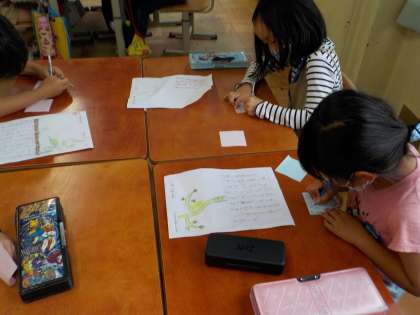書いた観察記録文をグループで読み合いました。「〜みたいという形という書き方がいいね。」「はっぱの数をちゃんと数えたんだね。」など友達の文章のいいところを見つけて付箋に書いていました。付箋を使っての交流もだいぶ慣れてきたようでした。