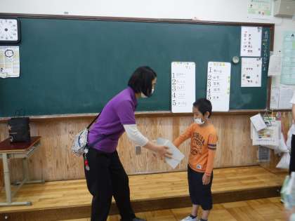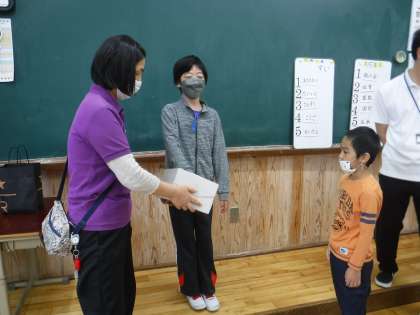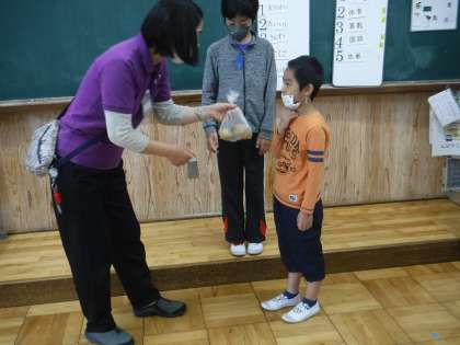 ジャガイモの抽選会で今日も盛り上がりました。取ったボールの番号とジャガイモが入った袋の番号が合うともらえます。