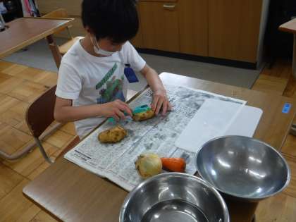 野外炊事でカレーを作ります。ジャガイモや人参・玉ねぎを切る練習をしました。そらいろの5年生は,包丁を持つのが初めてではないので皮むきも切るのも上手です。