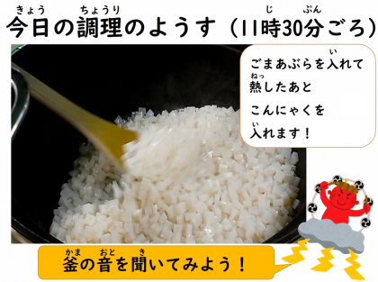 給食室の調理の様子の動画でも,実際の音を感じられたと思います。