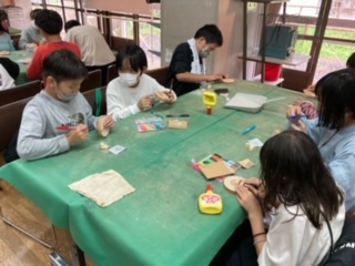 プレイホールの後は、本館に戻って来てリンゴジュースを飲みました。そして次は、研修室でウッド写真立て製作をしています。いい思い出の品が出来そうです。