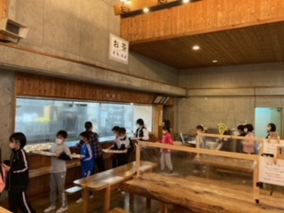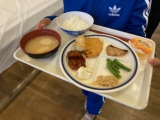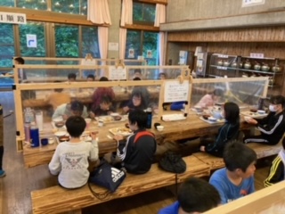 山の家の夕食です。並んで順番にごはん、味噌汁、おかずをもらって席まで運びます。お昼同様、セルフコーナーもあります。たくさん食べたいけれど、食べすぎないように。