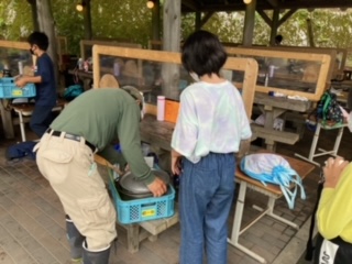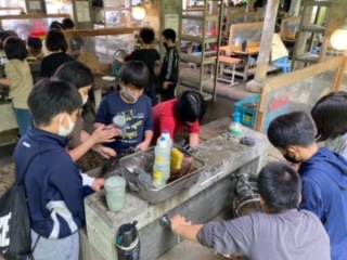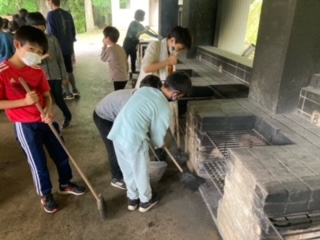 食事が終わりました。後片付けも協力して頑張ります。洗い物が終われば、山の家の先生のチェックが待っています。合格をもらえば完了です。使った場所の掃除もします。来た時よりも美しく!