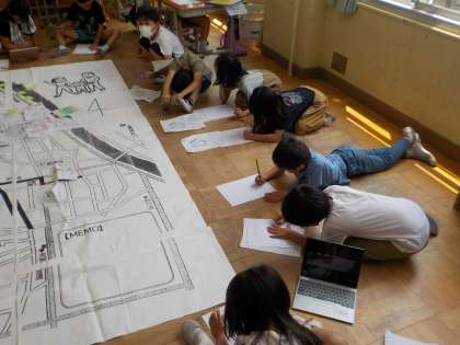 町たんけんに行って見つけたことをカードにまとめています。大きな地図を見て,歩いた道を思い出しながら書いています。