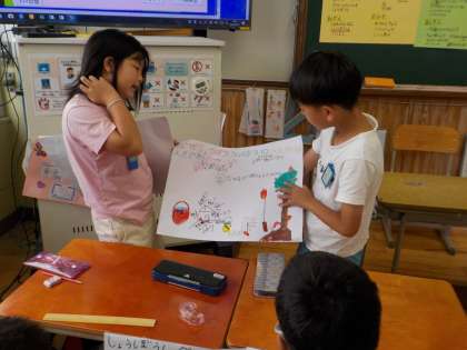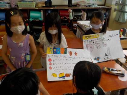 生活の学習で,調べた大宮のまちの素敵をクイズやポスターで友達に紹介しました。友達に紹介してもらうことで,知らなかったことをたくさん知ることができました。この日のために、準備を頑張ってきた子ども達はとても楽しそうに発表したり、発表を聞いたりしていました。