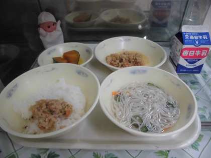 ごはん 牛乳 とりそぼろ丼(具) かぼちゃの煮つけ
