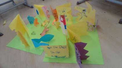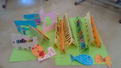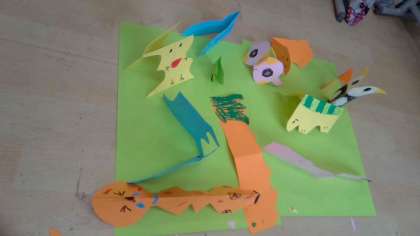 図画工作科「おってたてたら」の学習で、画用紙を 折って立ててみました。その後 切ったり 描いたりして 生き物を それぞれ作ってみました。生き物パークに集合しました。いろんな生き物がいますね〜。