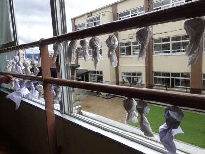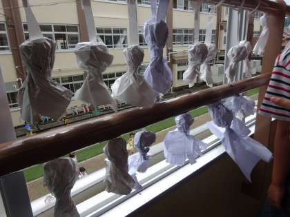 最近雨が続いているので子どもたちがてるてる坊主を作ってくれました。