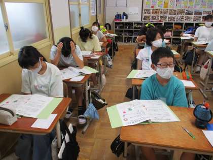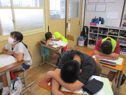 リラックスするための、呼吸の方法などを教えてもらい、子どもたちはそれぞれのリラックスできる体勢で、心を休めています。