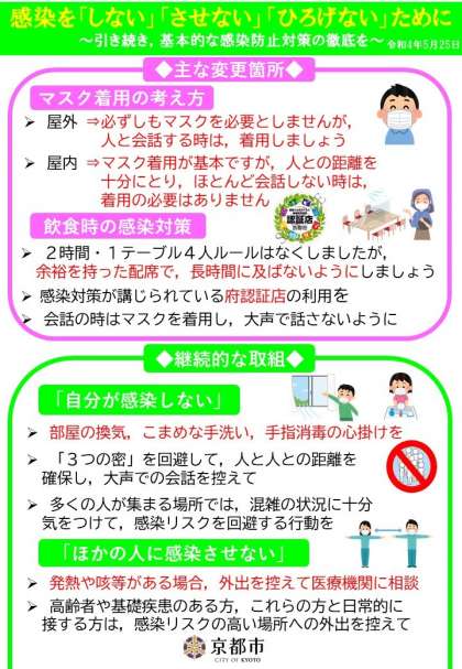 下記ポスターが京都市のホームページにあります。また,学校ホームページトップページの「教育委員会からのお知らせ」にあるコロナに関する通知や熱中症への予防なども参照にしていただけたらと思います。