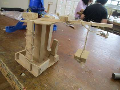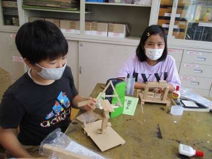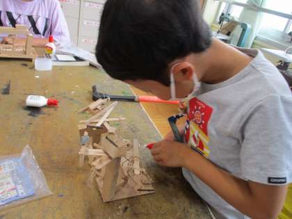 ひみつのすみかが完成しました!木材を糸のこぎりで切ったりボンドで池を作ったりエレベーターの仕掛けを作ったり、、、とてもいい作品ができました♪