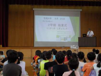 2学期が始まりました。2年生は体育館で始業式に参加しました。校長先生のお話を静かにきくことができました。