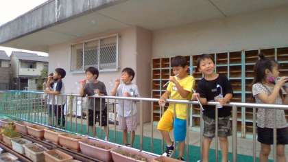 雨が上がり 晴れ間が見えてきたので、生活科の学習の 「しゃぼんだまをとばそう」を しました。