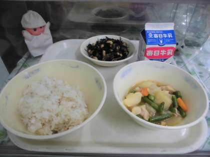 麦ごはん 牛乳 鶏肉と野菜の煮つけ ひじき豆 でした。