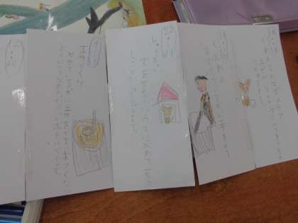 「どうぶつ園のじゅうい」の文章から学んだことを生かして,いろんな動物に関するお仕事の本を見ながらパンフレットを作りました。