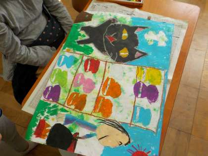 お話から想像して描いている絵が仕上がってきました。今日は、友達と絵を見合いっこして友達の作品がもっとよくなるようにアドバイスをしました。「友達からめっちゃいいアイデアもらった!」と言いながら最後の仕上げを頑張っていました。