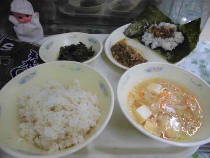 1年生は初めての献立でしたが、肉みそ納豆とごはんを上手にのりでまいて食べていました!