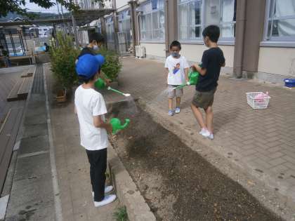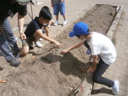 今日は、そらいろ畑に大根の種まきをしました。先週、畑の先生に教えていただいたようにしました。