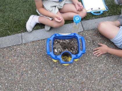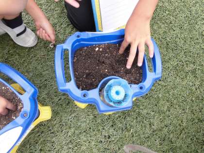 生活科「ぐんぐんそだておいしいやさい」で植木鉢に二十日大根のたねまきをしました。