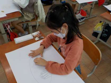 収穫したサツマイモを持つ自分を描いています。サツマイモを持つ手を描くのは難しそうですが、写真を参考にしながら、よく見て描いています。
