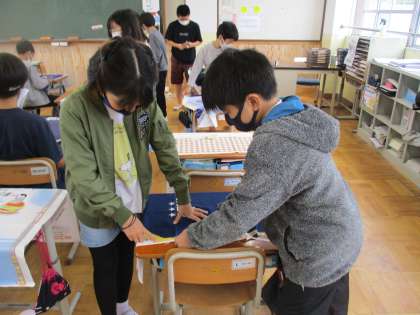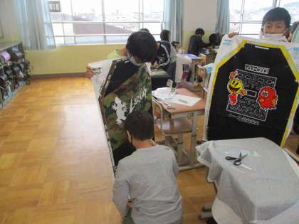 友達と協力しながらエプロンをつくります。