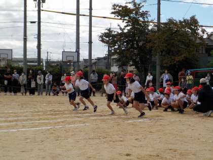 2年生の最初の種目は50m走です。お家の人達が見ている前で一位になりたいと、気合の入った表情でスタート位置にスタンバイしていました。どの組も練習より、すごく速かったです。