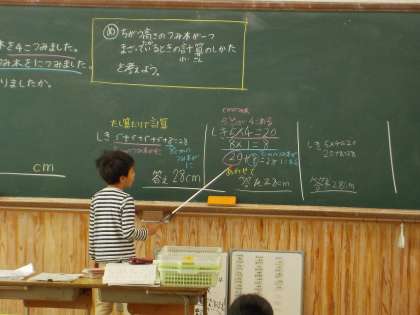 違う高さの積み木が1つだけ混ざっているときの計算のしかたを考えました。たし算だけでも計算できるけど、かけ算も使えるのかみんなで話し合って考えました。前で説明するときには、一気に説明するのではなく、途中で「ここまで分かりますか?」と聞く練習をしています。話すほうも聞くほうも相手意識をもてるといいですね。