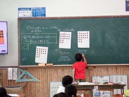 L字型にならんだおかしの数を、かけ算を使って計算する方法について考えました。図を使って、どんな式で計算できるか友達に発表しました。考え方をたくさん思いついて、3つも4つもノートに書いている子もいました。