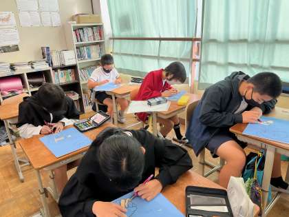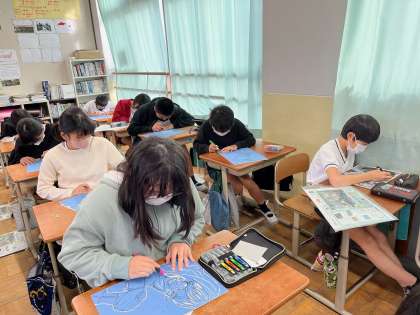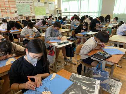 図画工作科「版画」の学習では、自分の顔を描いて彫刻刀を使って板を彫っています。