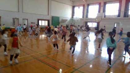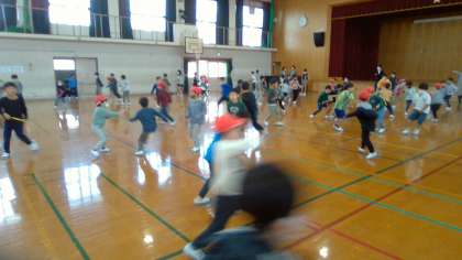 今日は、運動委員会が 計画してくれた 「1年生対2年生の しっぽとり大会」がありました。2年生のしっぽを すばやくとっている 1年生もいました。反対に しっぽをとられて 驚いている 1年生も いました。