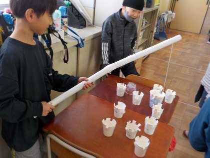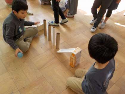 生活科で作ってきたおもちゃを、今日は学年のお友達に遊んでもらいました。子どもたちはたくさんの友達に遊んでもらえて、嬉しそうでした。クラスごとにいろいろな遊び方のおもちゃがありました。