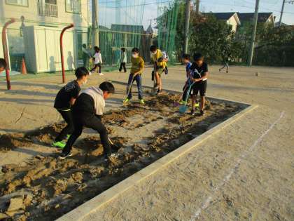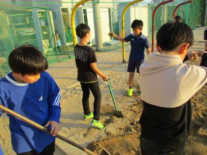 学習する砂場を使いやすくするために放課後に何人かが残って作業を手伝ってくれました。