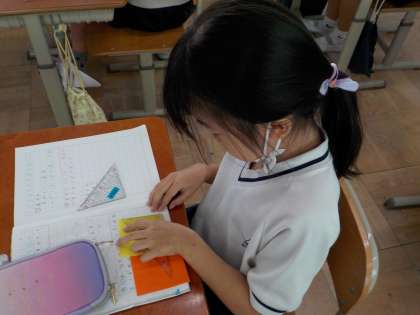 2年生では三角定規を使って、三角形や四角形の性質を学習します。今回は、折り紙で作った正方形と三角定規を使って、角の形や辺の長さを調べて、正方形の性質を見つけました。三角定規を使って直角を見つけることが上手になってきました。