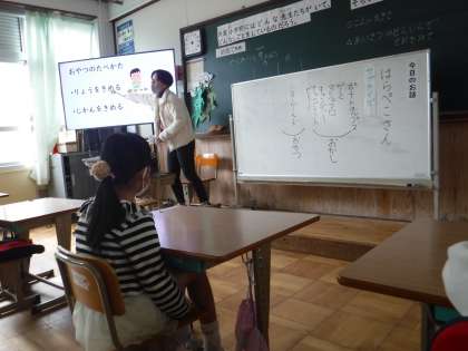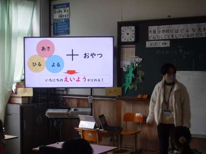 おやつには、おにぎりやふかし芋もあることや量や食べる時間についても教えてもらいました。楽しいおやつですが、ジュースならコップに入れることやポテトチップスはお皿に入れて食べるといいことがわかりました。