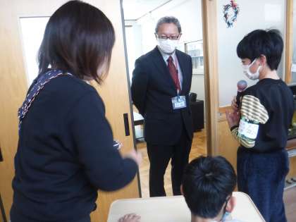 今日は、校長先生や教頭先生・事務室・保健室に行きました。腕には、そらいろオリジナルの腕章をつけています。「どんな仕事をしていますか?」「すきな仕事はなにですか?」「うれしい時はどんな時ですか?」など質問をしました。インタビュー・写真・音声それぞれ担当を決めて行きました。
