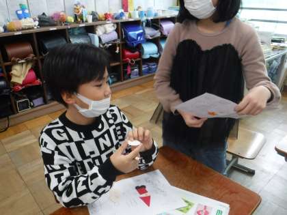 カード作りをしました。丸や三角・四角などの形を使って楽しいカードを先生のお店で英語でやりとりをしてもらい作りました。できたカードを友だち同士交流して見せ合いました。