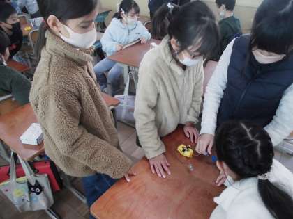 自分たちで回路を作り、豆電球をつけることができました!!