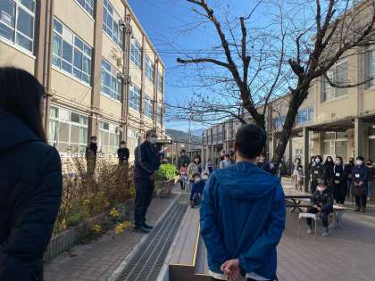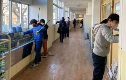 校舎の廊下や窓、階段とモップや雑巾をつかい、普段、子どもたちでは手の届きにくいところを中心にお掃除しました♪