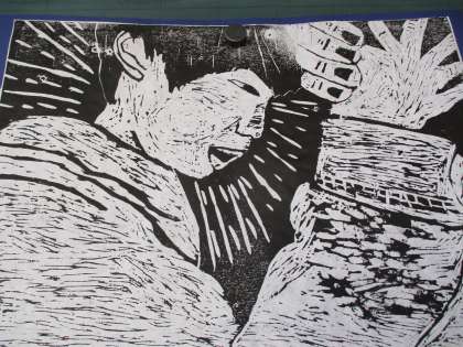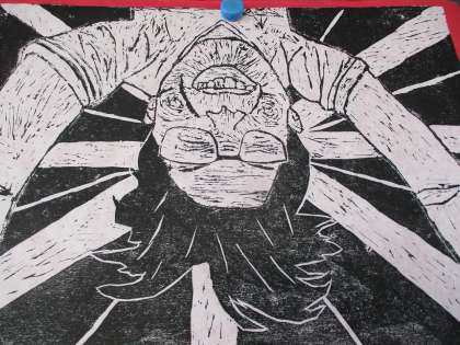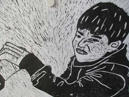 版画では、歯を食いしばっている表情が分かるように丁寧に彫進めました。