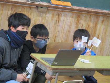 Let's go!など、学習した簡単な表現を繰り返して、物語を作っていました。