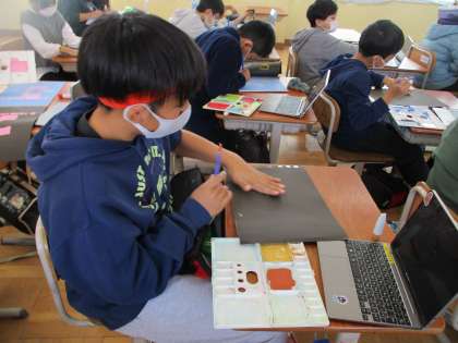 2学期に板を彫り終え、着色をしています。