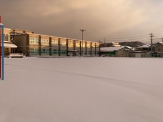昨日から降り積もった雪で、一面真っ白です。写真は朝7時半ごろの運動場の様子です。