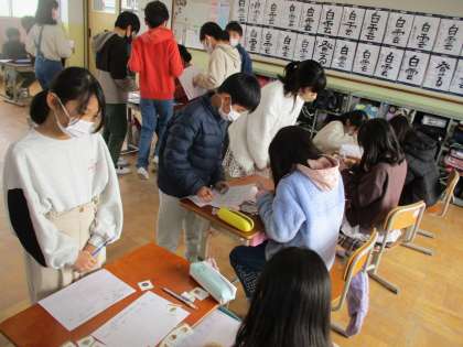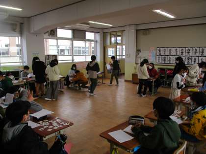 学年全体で英語の食べ物カードをやりとりします。