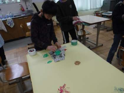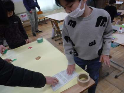 お祝いの掲示をスタンピングでしました。葉っぱを作り模様がよく出るように工夫し、好きな色を作りスタンピングしました!
