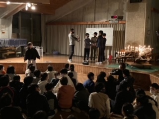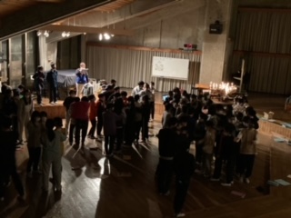 各クラスのレク係が準備してきたゲームで盛り上がっています。落ちた落ちた、人間知恵の輪、じゃんけん列車、どれも楽しんでいます。